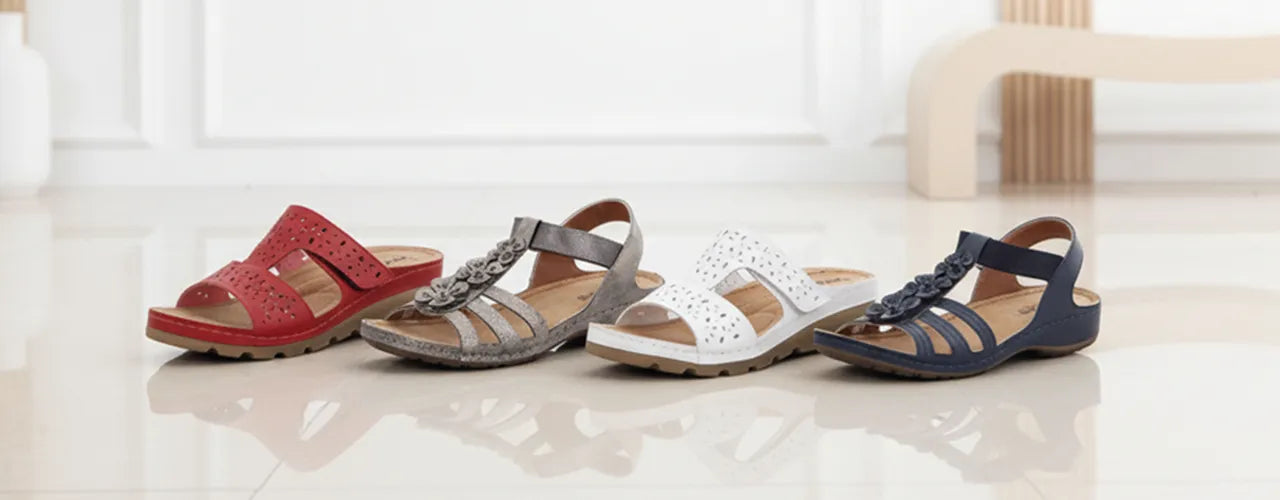Frühjahr- / Sommerschuhe sind leicht, weich und farbenfroh. Aber auch uni Modelle stehen bei uns hoch im Trend. Ob sommerliche Sandalen mit Blümchenapplikationen, Pantoletten in knalligen Farben, Schnürschuhe mit Cutouts, Sandaletten mit Korkabsatz oder klassische Ballerinas und Slipper - hier schlägt jedes Frauenherz höher.